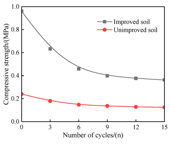 Using untreated expansive soil as a control, the experimental results demonstrate significantly less mechanical property degradation after wet–dry cycles compared to the improved soil. This difference primarily stems from the untreated soil’s initially poor mechanical properties, which leave little room for further deterioration. Importantly, even after cyclic wet–dry exposure, the treated soil maintains mechanical properties substantially superior to those of untreated expansive soil.
