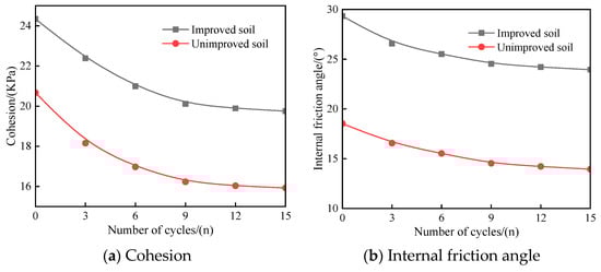 The results of the direct shear tests on the specimens after wet–dry cycling are shown in Figure 10. Similarly to the UCS results, the shear strength parameters, namely the cohesion (c) and the angle of internal friction (φ), gradually decreased with an increasing number of wet–dry cycles, also exhibiting a rapid initial decline followed by a more gradual reduction. After 15 wet–dry cycles, the cohesion of the MICP-treated soil samples decreased from 24.34 kPa to 19.74 kPa, a total degradation of 18.92%, while the angle of internal friction decreased from 29.34° to 21.54°, a total degradation of 26.59%. The degradation rate was most pronounced during the first nine wet–dry cycles, with the cohesion decreasing from 24.34 kPa to 20.11 kPa (91.86% of the total degradation) and the angle of internal friction decreasing from 29.34° to 22.45° (88.37% of the total degradation). Despite experiencing greater degradation in cohesion and internal friction angle under wet–dry cycles than untreated soil, the improved soil maintained its superior shear strength—surpassing untreated soil by 23.9% in cohesion and 71.8% in internal friction angle after 15 cycles.
