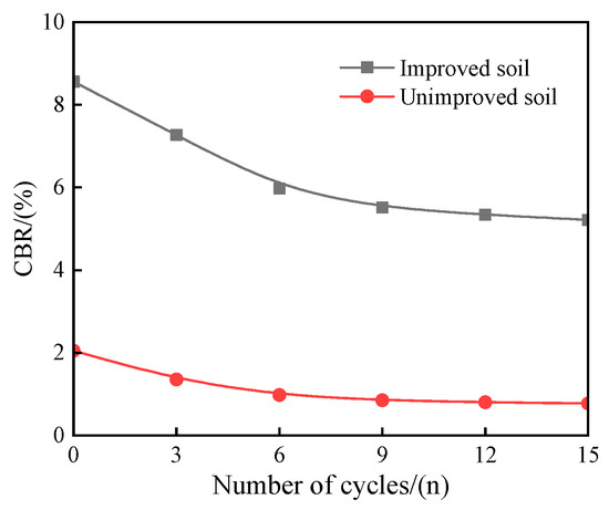 The results of the CBR tests after wet–dry cycling are presented in Figure 11. The CBR value of the MICP-treated soil samples also decreased with an increasing number of wet–dry cycles, following a similar trend of a rapid initial decline and a more gradual reduction. After 15 wet–dry cycles, the CBR value decreased from 8.56% to 5.21%, a total degradation of 39.05%. The majority of the CBR degradation, 91.14% of the total, occurred within the first nine wet–dry cycles, where the CBR value decreased from 8.56% to 5.51%. Meanwhile, the CBR of the untreated expansive soil decreased from 2.05% to 0.77%, representing a total degradation of 62.43%, and the final strength of untreated soil fell significantly below the standard requirement.