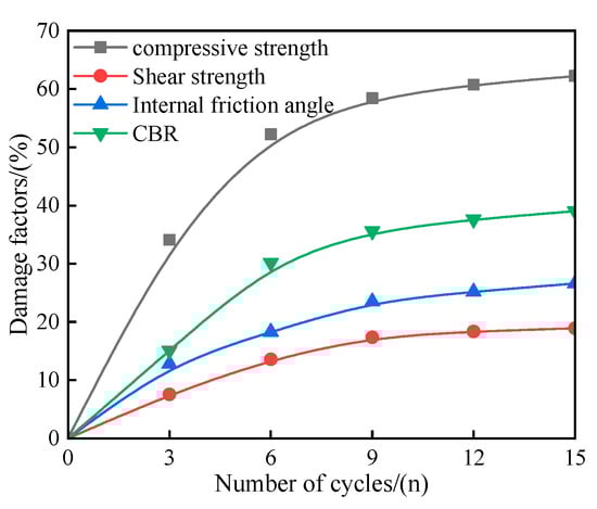 where DV represents the damage factor; S denotes the mechanical property value after wet–dry cycling; S0 indicates the initial mechanical property value; DS signifies total degradation; VS refers to the degradation rate; a is the number of wet–dry cycles; and f(x) represents the degradation curve for various parameters.