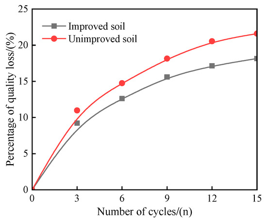After 15 wet–dry cycles, the total mass loss of the MICP-treated soil specimens was 18.15%. However, the majority of the mass loss, 86% of the total, occurred within the first nine wet–dry cycles, where the mass loss rate reached 15.61%. Furthermore, after 15 drying–wetting cycles, the stabilized expansive soil showed an 15.97% lower mass loss rate than the untreated soil.