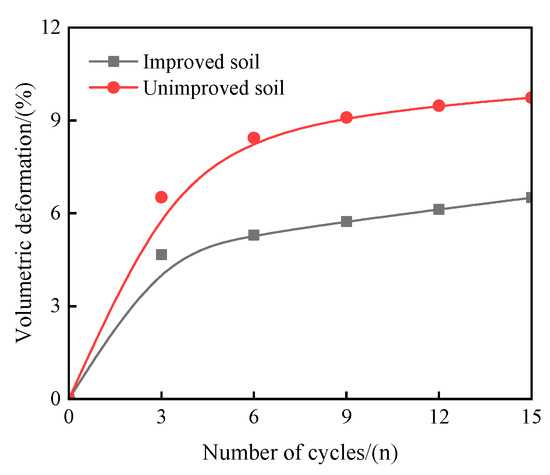 After 15 wet–dry cycles, the total volume expansion of the MICP-treated soil specimens was 6.53%. However, the majority of the volume expansion, 71.36% of the total, occurred within the first three wet–dry cycles, where the volume expansion reached 4.66%. Furthermore, after 15 drying–wetting cycles, the stabilized expansive soil exhibited a 33.20% reduction in its volumetric expansion rate compared to the untreated soil.
