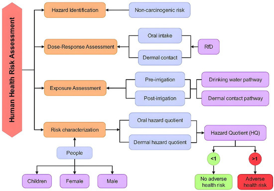 Evaluations of groundwater quality and environmental management need the help of health risk assessments. In this study, a four-stage risk assessment process comprising hazard identification, dose–response assessment, exposure assessment, and risk characterization was implemented for the health risk evaluation of groundwater nitrate contamination (Figure 2).