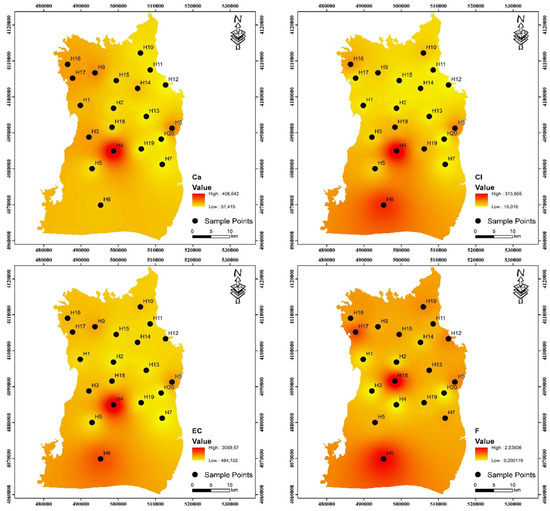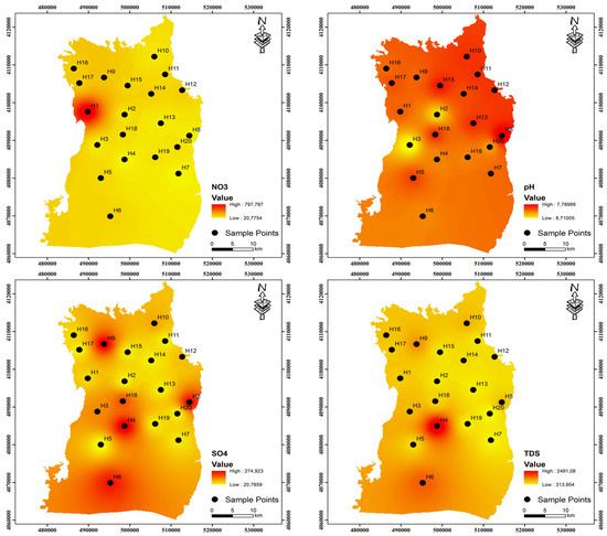 All maps are produced using Arc GIS. V 10.3. The inverse distance weightage (IDW) approach, which is utilized for spatial modeling and determining the geographical distribution of groundwater-quality characteristics, was used to interpolations [28].