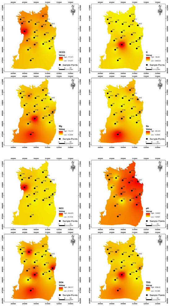 One of the most crucial factors determining the quality of drinking water is pH. Water corrosion is caused by low pH levels, while high pH levels negatively impact human skin and eye health as well as water taste [29,30]. The research region’s values of pH ranged from 7.00 to 7.70 and 6.71 to 7.79, with averages of 7.40 and 7.34 during the pre-irrigation and post-irrigation periods, respectively. These results suggest that the water quality in the area is alkaline. It was observed that the pH values measured in both periods were close to each other. The pH range that the WHO recommends (6.5–8.5) is still met by all of the samples. The amount of dissolved particles in the water directly affects the electrical conductivity (EC) of the water [31]. The EC concentrations of the samples varied between 484 and 3090 μS/cm during the pre-irrigation period, possessing an average of 977.40 μS/cm, and between 483 and 3833.63 μS/cm during the post-irrigation period, with a mean of 1105.13 μS/cm (Table 1). Total dissolved solids (TDS) are a unit of measurement used to describe the total quantity of salt solubilized in water. While very high TDS can also be caused by chemical fertilizers, residential wastewater, and irrigation return flows, it generally denotes the extent of rock–water interactions [32,33]. In both irrigation periods, TDS values vary from 314.60 to 2008.50 and 313.95 to 2491.86 mg/L, with means of 635.31 and 718.3 mg/L, respectively. The current study presents the regional distributions of analytical cations and anions during both periods, as illustrated in Figure 3 and Figure 4.