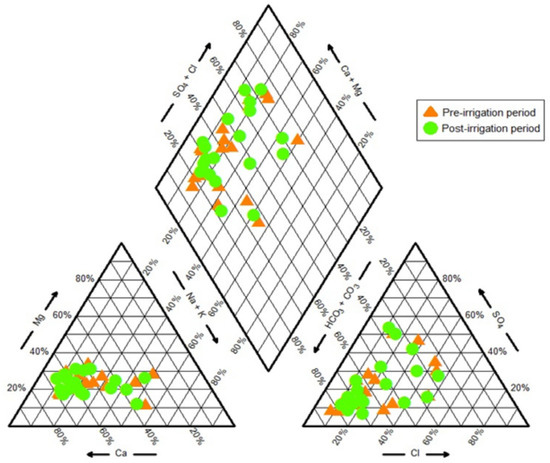 The hierarchy of cation prevalence in groundwater on Harran Plain is Ca2+ > Na+ > Mg2+ > K+, based on their average concentrations for both periods. One of the most prevalent cation ions in the groundwater of the area under study is sodium. In general, fertilizer use and the weathering of minerals like feldspar are the most frequent sources of Na+ in the research area [34,35]. Within the study area, the Na+ content varied between 15.89 and 295.41 mg/L, with a mean of 65.60 mg/L during the pre-irrigation period and 12.58 to 230.89 mg/L with a mean of 54.71 mg/L during the post-irrigation period (Table 2). In the groundwater of the research region, Ca2+ is the most prevalent cation ion next to Na+. Within the research region, the average calcium concentration was 123.59 mg/L during the pre-irrigation period, ranging from 57.40 to 408.60 mg/L, and 124.14 mg/L during the post-irrigation period, ranging from 52.56 to 502.31 mg/L. The permissible level of 100 mg/L for drinking water is exceeded at two sample stations during the pre- and post-irrigation periods [6]. One element that is frequently present in the environment is magnesium. Mg2+ concentrations were found to range between 12.22 and 115.43 mg/L during the pre-irrigation period, with a mean of 35.76 mg/L, and 13.20 and 105.09 mg/L during the post-irrigation period, with a mean of 31.67 mg/L. In this investigation, K+ is far less concentrated than Na+. This may result from K+’s propensity to be reabsorbed throughout groundwater circulation [36]. In the pre- and post-irrigations, it ranges from 0.66 to 189.35 and 0.53 to 161.21 mg/L, respectively.