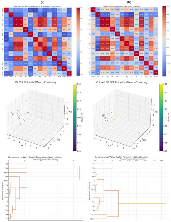 In Figure 6a, the left panel displays the Pearson correlation heatmap showing strong linear relationships, particularly between EC–TDS and Na+–Cl−. The center panel illustrates a 3D PCA plot revealing the clustering of wells based on similar hydrochemical signatures. The right panel shows a dendrogram based on hierarchical clustering (Ward linkage) of water quality parameters, highlighting close associations such as EC–TDS and Ca2+–HCO3−. As seen in Figure 6b, the correlation heatmap on the left shows noticeable shifts in inter-parameter relationships, especially increased correlation between NO3− and Cl−, likely due to agricultural return flows. The 3D PCA scatter plot in the middle captures altered well groupings, suggesting seasonal shifts in groundwater chemistry. The rightmost dendrogram reflects changes in parameter clustering patterns, with anthropogenic indicators such as NO3− and K+ becoming more dominant in cluster formation.