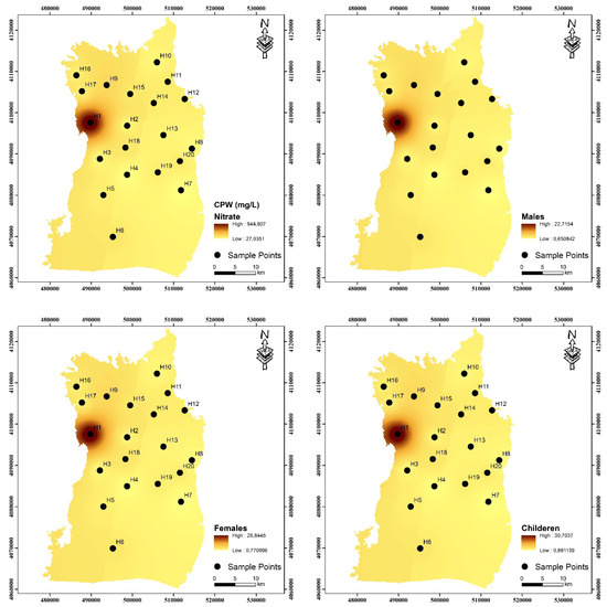 Numerous studies have demonstrated the health hazards associated with NO3− exposure in drinking water are significantly higher for children compared to adults. For instance, one study indicated that the health risks for children through drinking water intake are approximately 1.54 times greater than those for adults, primarily due to their smaller body size and higher water consumption relative to their weight [46]. This heightened sensitivity is attributed to their developing gastrointestinal systems, which may absorb pollutants more readily [50]. Moreover, health risk assessments have demonstrated that children are at a higher risk of non-carcinogenic health hazards related to NO3− contamination. In a study conducted in northeastern Iran, it was found that the health risks for children exceeded the acceptable limits set by health authorities, indicating a pressing need for intervention in areas with high nitrate levels [51]. Similarly, another study highlighted that approximately 14.28% of the groundwater samples were above the hazard quotient threshold for children, highlighting their heightened susceptibility [52].