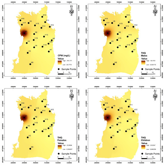 Regional maps created with GIS software showed the spatial distributions of non-carcinogenic human health risks. The consequences of non-carcinogenic health risks are illustrated in Figure 7 and Figure 8. The findings indicate that the total non-carcinogenic risks for both children and adults predominantly arise in the western region of the research area. The areas exhibiting the greatest hazards throughout both periods were located adjacent to the fertilizer manufacturing facility, signifying that the fertilizer manufacturing facility poses the most significant harm to human health in the study region. The north of the research region has a lower population and greater agricultural land, whereas the southern section has a higher population and increased population density. The elevated risk in the south is also associated with human activity. Residents utilizing water at these locations must seek an alternative water source to meet their domestic requirements and mitigate health hazards associated with NO3− contamination. This study attributes NO3− pollution to agricultural activity. In the future, specific interventions for the human health concerns associated with NO3− will concentrate on enhancing agricultural practices, such as minimizing nitrogenous fertilizer usage and altering irrigation methods.