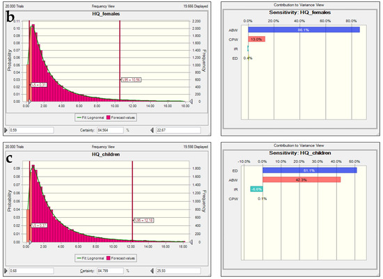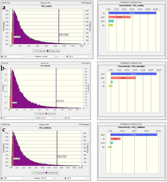 The nitrate HQ uncertainty and sensitivity analysis histograms for (a) adult males, (b) adult females, and (c) children in the post-irrigation period.