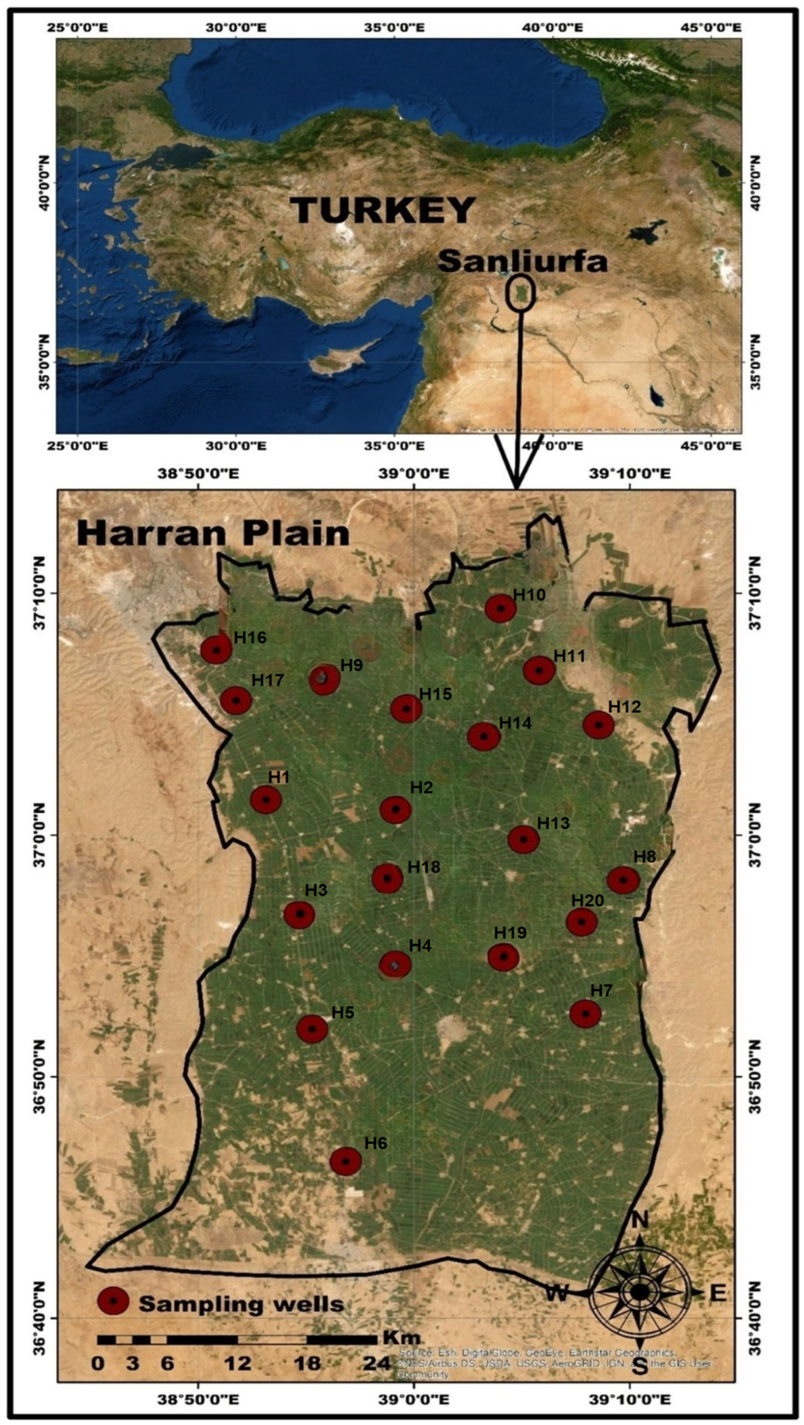 The Harran Plain represents the most extensive irrigation region in southeastern Türkiye, a nation possessing the biggest groundwater reserves in the Middle East. Figure 1 illustrates the location map of the study region. It is located between 36°42′–37°10′ N latitude and 38°50′–39°10′ E longitude. The watershed in the area is 3.700 km2, of which 1.500 km2 is the main plain. The research area obtains 463.6 mm of annual long-term mean precipitation, which is indicative of a semi-arid climate. The average annual temperature over the long period is 18.4 °C, and the evaporation is 1848 mm. The largest investment in the Turkish Republic’s history, two 26.4 km subterranean tunnels connected to the Atatürk Dam, were completed before agricultural regions were irrigated.