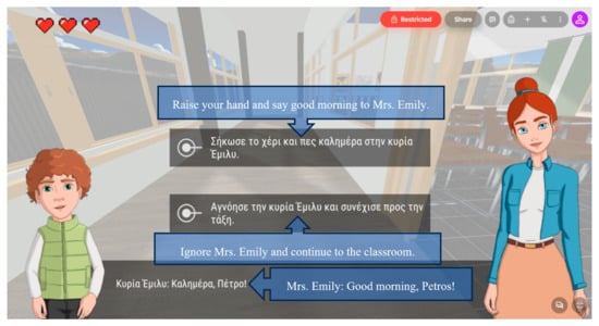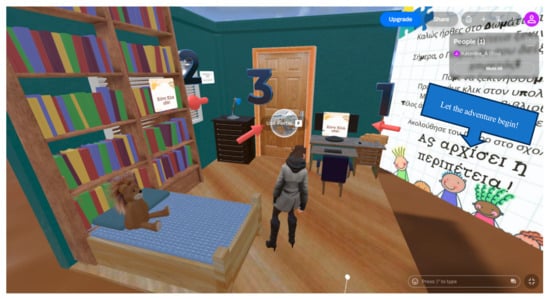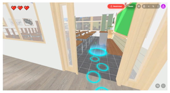 In the “Peter’s School” scene, the player is engaged in a virtual school environment with classrooms and hallways. The character Peter appears as a guide within this scene; he introduces himself to the player and explains the next interactive task. The player is guided along a path marked by visual indicators on the floor, leading to the next interactive activity (Figure 2).