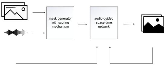 The proposed framework consists of two components: the audio-visual mask generator with a scoring mechanism and the audio-guided space–time memory network. First, paired images and audio clips are input into the mask generator. Subsequently, this module generates the mask of a sounding object and transmits it to the audio-guided space–time memory network. Lastly, the audio-guided space–time memory network leverages both historical and current masks to track the sounding object and determine whether to output the target mask based on the audio guidance.