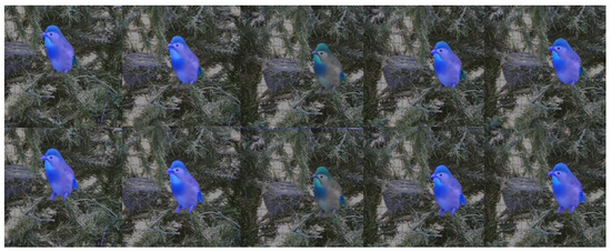 In Equation (1), n indicates the total number of masks, denotes each image block, and represents the ranking function; the index of the ranking corresponds to the result computed by the scoring function, as presented in Equation (2). In Equation (3), and denote the weighting parameters for area and similarity, respectively, represents the normalized area, and and correspond to the audio embedding and image embedding.