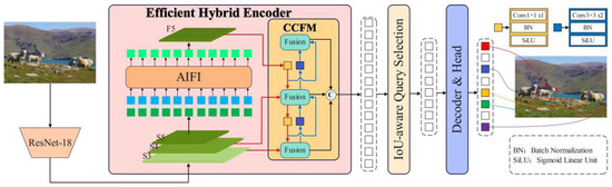 The RTDETR-R18 architecture primarily comprises three components: a backbone network, hybrid encoder, and decoder with an auxiliary prediction head. The hybrid encoder combines an attention-based intra-scale feature interaction (AIFI) module, which operates similarly to a transformer encoder by encoding the S5 feature map through self-attention mechanisms, and a CNN-based cross-scale feature fusion module (CCFM), which is optimized to enhance cross-scale fusion through multiple convolutional blocks inserted into the feature propagation paths. The decoder employs an Intersection over Union (IoU)-aware query module that models the joint latent variables of the encoder features by constructing and optimizing cognitive uncertainty, thereby generating high-quality queries for precise detection.
