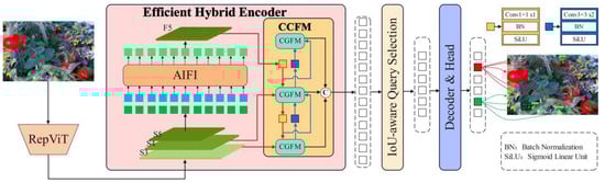 Various implementations of object recognition in agricultural produce detection systems have been achieved through representative CNN-based single-stage detectors, particularly the single-shot multibox detector (SSD) [10] and you only look once (YOLO) [11] approaches. The operational superiority of these models is derived from their sustained real-time inference speeds and energy-efficient computation, which satisfy the stringent requirements for resource-constrained edge deployment in precision agriculture scenarios. Notably, Xin et al. [12] replaced the backbone network of an SSD with a lightweight MobileNetV3 network and enhanced its original model framework using depthwise separable convolutions to achieve a recognition accuracy of 92.5%, a 7.9% improvement over that of the baseline model. Zheng et al. [13] enhanced the original YOLOv8 model by integrating a Large Separable Kernel Attention mechanism, dynamic upsampling layer, and Inner Intersection over Union loss function. The modified model achieved a recognition accuracy of 99.4% on a test dataset, demonstrating a 3.3% higher precision than that provided by a YOLOv5 model. Although CNN-based models typically exhibit satisfactory detection accuracy, two critical steps—threshold filtering and non-maximum suppression (NMS)—dictate their robustness and inference speed [14]. The Real-Time Detection Transformer (RTDETR) [15] is a novel detection method that eliminates the need for NMS post-processing, thereby reducing optimization complexity and enhancing robustness. Nevertheless, challenges persist in RTDETR implementation, including redundant backbone architectures and suboptimal data flow between modules.
