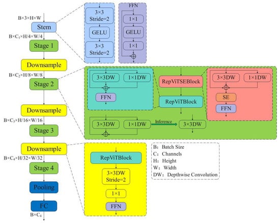 The RepViT backbone achieves a lightweight design through structural reparameterization [25]. Its architecture comprises three core components: the initial embedding layer (Stem module), multistage stacked RepViT blocks (Stage module), and depthwise separable downsampling layers (Downsample module). The detailed structural configuration is shown in Figure 5. The Stem module performs 4× downsampling via two stride-2 3 × 3 convolutions, each followed by Gaussian error linear unit (GELU) activation [27] to balance computational efficiency and shallow feature extraction. The Stage module alternates between the RepViTSE and RepViT blocks. The RepViTSE block employs multibranch depthwise convolutions [28] during training that are later merged into a single branch through structural reparameterization during inference and integrates SE attention [29] by utilizing global average pooling [30] and two fully connected layers to dynamically recalibrate the channel weights. In contrast, the RepViT block simplifies the branch structures to optimize computational efficiency. Both blocks utilize a feed-forward network (FFN) comprising 1 × 1 convolution with the GELU and residual connections to enhance feature representation. Finally, the Downsample module integrates four core components: depthwise separable convolution, pointwise convolution [31], an FFN, and the RepViT block. During training, structural reparameterization is leveraged to fuse multi-branch operations, which are streamlined into single-branch inference steps. Simultaneously, 1 × 1 convolutions regulate channel-dimensionality adjustments, while the internal FFN optimizes feature-interaction refinement.