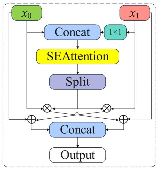 where c0 and c1 represent the respective channel dimensions of the x0 and x1 input feature maps; x′0 refers to the channel-aligned version of x0 after 1 × 1 convolution; the x′concat concatenated feature map is generated by concatenating x′0 and x1 along the channel axis; ω denotes the channel attention weights computed by the SE mechanism; the weighted feature map xweighted is split into x0weighted and x1weighted, which correspond to the reweighted versions of x′0 and x1, respectively; x0fused and x1fused are obtained by elementwise addition of the cross-weighted features; and the final Output is the concatenated feature map derived from x0fused and x1fused, integrating multi-scale contextual information for downstream tasks.