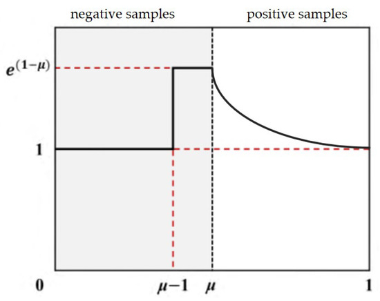 The RTDETR employs the Hungarian matching algorithm to assign positive and negative samples with its original VFL classification function [20]. However, the fixed weighting parameters in VFL struggle to adapt to the dynamic label assignment used in RTDETR, leading to classification ambiguity in dense-object scenarios [35]. The Sliding Loss (SlideLoss) function [26], which dynamically adjusts sample weights based on their quality and distribution characteristics, was applied to address these limitations by enhancing the supervision signals in the boundary regions between positive and negative samples, effectively mitigating class imbalances and sample quality discrepancies in object detection. The adaptive weight variation of the Sliding Loss function, which prioritizes high-quality samples while suppressing noisy and ambiguous samples, is shown in Figure 8, where μ represents the threshold parameters for positive and negative samples.