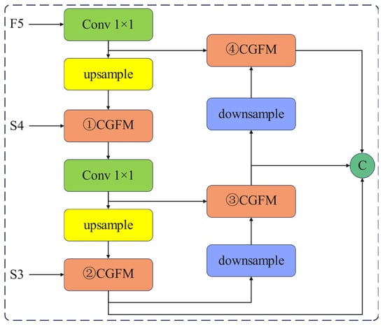 Schematic diagram of CGFM insertion points in the feature fusion network, where S3 represents stage 3 feature map from the backbone network; S4 represents stage 4 feature map from the backbone network; F5 represents processed feature map from stage 5 after AIFI module.
