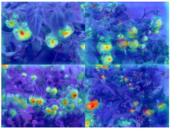The Group 3 and 5 results indicate that introducing the CGFM enhanced the mAP50 by 1.8% compared to Group 2, with marginal increases in the number of parameters (+0.3%) and inference speed (+0.9 FPS). These performance improvements stem from the adaptive multiscale feature fusion mechanism in the CGFM, which enhanced the contextual awareness of the agricultural targets through hierarchical feature interactions. Notably, the use of the CGFM achieved superior detail preservation in this complex field environment while maintaining computational efficiency, which is a critical requirement for real-time agricultural vision systems. The heatmap analysis shown in Figure 10 demonstrates the enhanced feature fusion capability of the improved CGFM module. Both green and red fruits exhibited concentrated attention regions in their lower-middle sections, indicating robust multiscale object recognition that effectively avoided misclassifying green foliage as immature fruit.