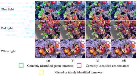 The performances of the four evaluated detection models when applied to the recognition of dense tomato clusters in challenging agricultural environments are compared in Figure 12. The green and red bounding boxes respectively denote correctly detected green and red tomatoes, whereas the yellow boxes indicate missed detections. This visual comparison clearly demonstrates the robustness of LiteTom-RTDETR against complex illumination variations and partial occlusions, with the proposed model significantly outperforming the other models in low-light and vegetation-obstructed scenarios. Under blue light conditions, both RTDETR and LiteTom-RTDETR completely detected occluded fruits, whereas Faster-RCNN and YOLOv8m missed some fruits. Under red light conditions, Faster-RCNN and YOLOv8m persistently missed detections and RTDETR exhibited edge-related false positives, misclassifying ground surfaces as green tomatoes. Under white light conditions, LiteTom-RTDETR maintained detection integrity under 60–80% foliage occlusion, whereas both Faster R-CNN and YOLOv8m failed to detect fruits, and RTDETR generated duplicate detections in high-density regions. This comparison confirms that LiteTom-RTDETR exhibits superior accuracy and reliability for automated tomato-monitoring systems in practical field environments.