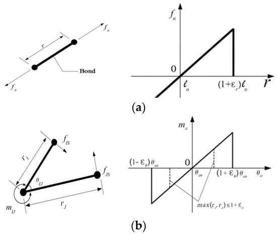 Description of bond crack criterion: (a) normal bond force vs bond length; (b) bond moment vs. bond angle.