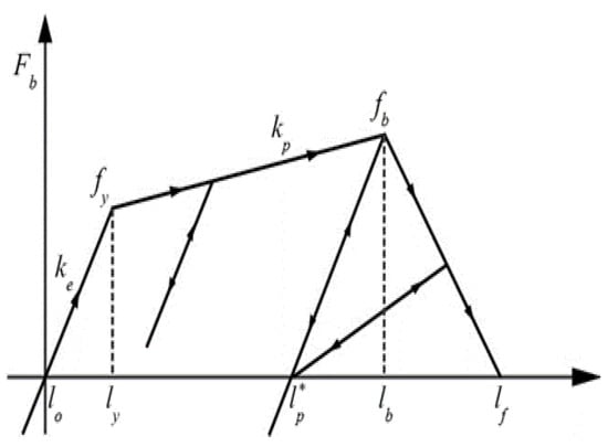 The mechanical behavior of the bond is characterized by several dimensionless parameters: represents the ratio of plastic to elastic stiffness, and , , and denote the yield, plasticity-fracture transition, and failure strains, respectively. Using these parameters, the maximum plastic bond length can be determined using the following expressions: is expressed as , the yield strength of bond as , and the evolution of the bond resistance as , based on the geometric configuration depicted in Figure 3. The elastoplastic SW-DVIB parameters were calibrated as follows: