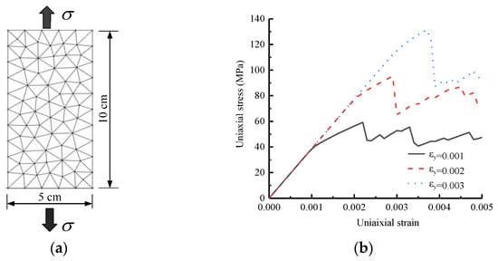 To examine how the micro-bond parameters affect the macro-mechanical behavior of the material, a uniaxial tensile simulation was performed using The SW-DVIB model employed in the study of the 2D specimen, which was used in the simulation, as illustrated in Figure 4a, with dimensions of , and a three-node triangular cell was employed. Young’s modulus was set at , which was chosen because it represents the realistic macroscopic post-yield (plastic) stiffness of the material, providing an appropriate benchmark for capturing the elastoplastic behavior.