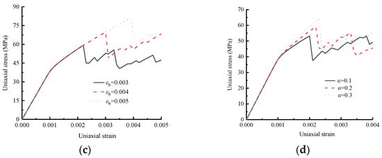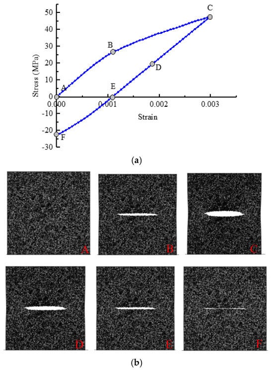 The simulated stress–strain relationship is shown in Figure 6a. There is an obvious linear segment from point A to point B and a nonlinear segment from point B to point C in the loading phase. The unloading curve is parallel to the initial loading curve. This indicates that Young’s modulus in the unloading stage is corroborated by the initial Young’s modulus. When the axial stress decreased to , i.e., point E in Figure 6a, the specimen exhibited an obvious unrecoverable plastic deformation. The stress in the specimen changed from tensile to compressive as the strain decreased from Point E to Point F.