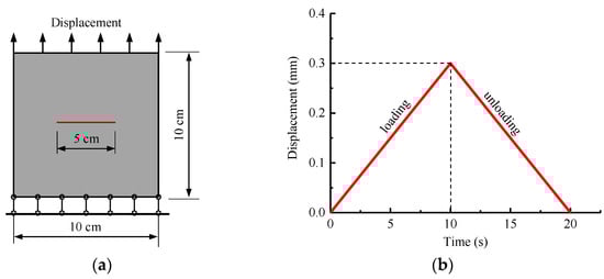 The simulated case involved the uniaxial tension of a rectangular plate featuring a pre-crack. As illustrated in Figure 5a, the sample used in the simulation measured with a centrally located pre-crack extending in length. The three-node triangular cell configuration comprising a total of 25,654 triangular cells is applied. The displacement loading path, depicted in Figure 5b, consists of a loading phase during the first 10 seconds, followed by an unloading phase from the 10 to the 20th second. The micro-bond parameters used as inputs were .