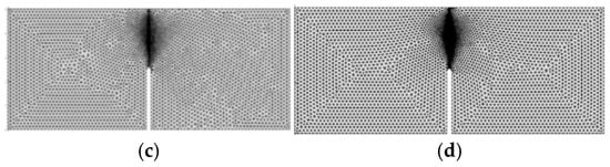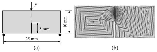 This approach incorporates fracture energy into the fracture model to ensure that the results remain unaffected by mesh-size sensitivity. To examine the impact of fracture energy, three-point bending tests were conducted using two different methods: accounting for fracture energy and disregarding it. The dimensions of the specimen and meshing configuration are illustrated in Figure 7, where three types of meshes were applied: coarse, middle, and fine.