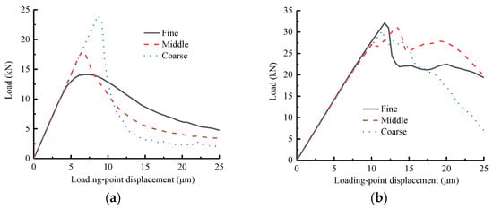 In the initial case, the fracture energy was excluded by setting with the parameters of the micro-bonds defined as and . In the second case, the micro-bond parameters remained unchanged from those in Case I, except for the inclusion of fracture energy, specified as . The load–displacement behavior at the loading point is depicted in Figure 8. The simulated results for Case I without considering the fracture energy are illustrated in Figure 8a. It is evident that the highest force diminishes gradually with a decrease in element size. In Case II, in which the fracture was considered, as shown in Figure 8b, the simulated results were unaffected by the element dimensions.