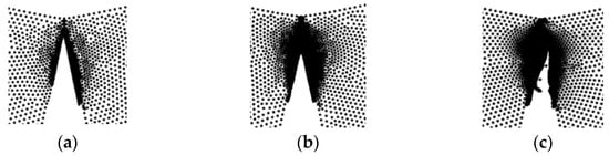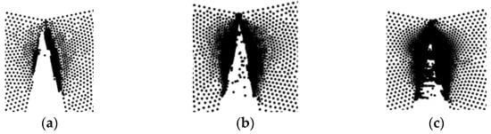 The crack-opening deformation is shown in Figure 6b(B–D), corresponding to points A–F, respectively, as shown in Figure 6a. In the loading stage, the crack opening deformation increased with an increase in displacement. When the axial stress dropped to , the crack did not close, as shown in Figure 6b(F), which was caused by unrecoverable plastic deformation. These simulated phenomena demonstrate that the model can be used to model irreversible material deformation.