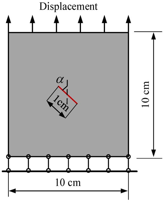 To assess the effectiveness of the model in simulating material fractures, a uniaxial tension test was performed on a rock specimen containing a pre-crack [66]. A simplified representation of the material samples is shown in Figure 11. The primary objective of this test was to examine the effect of the pre-crack dip angle on the failure condition of the material. According to test result [66], the micro bond parameters are confirmed as and .
