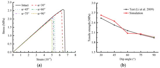 As shown in Figure 12a, the simulated uniaxial stress–strain relationship for various pre-crack cases reveals a decrease in the specimen tensile strength with an increase in the pre-crack dip angle. The corresponding simulated relationship between the uniaxial tensile strength and pre-crack dip angle (Figure 12b) is largely consistent with experimental observations [66].