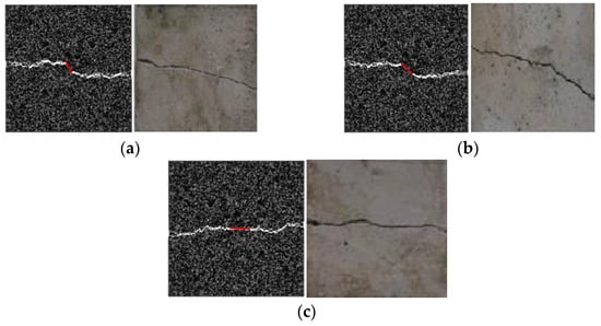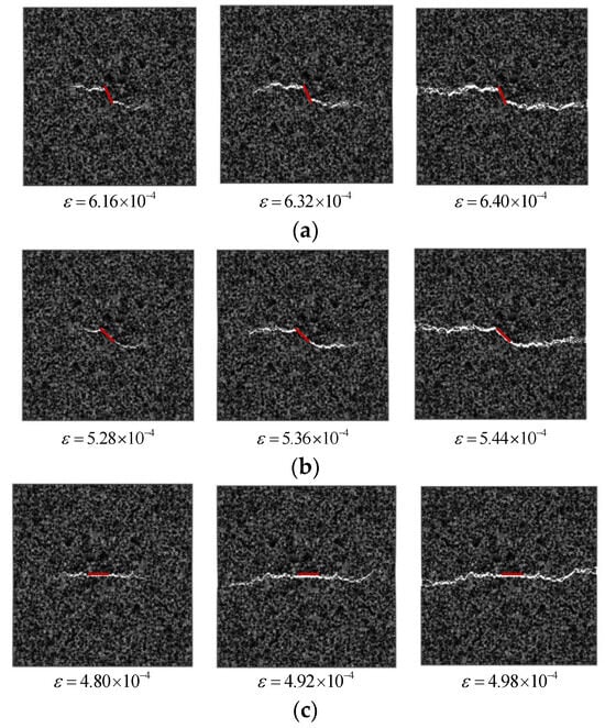 Simulated fracture process where the pre-crack exhibits varying dip angle: (a) ; (b) ; (c) .