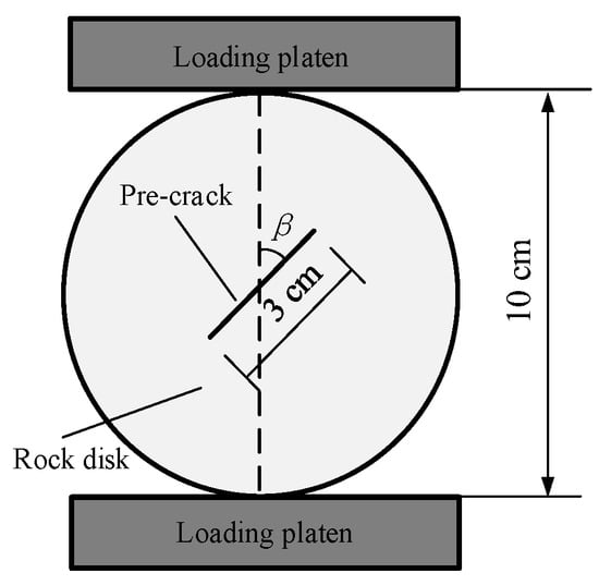 To rigorously validate the predictive capabilities of the SW-DVIB framework for simulating fracture mechanics, a central straight-through-crack Brazilian disk (CSCBD) test was conducted. This test enables a systematic investigation of the crack initiation, propagation, and coalescence in brittle materials under controlled loading conditions. The geometric configuration and boundary conditions of the CSCBD specimens are shown in Figure 15, where the displacement-controlled loading was imposed along the vertical axis. The micromechanical input parameters were calibrated as follows: and . This parameter selection ensures consistency with experimental benchmarks and theoretical fracture mechanics principles.