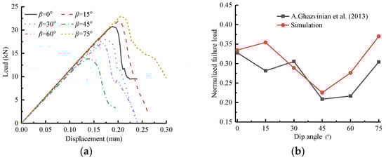 Simulated outcomes for scenarios with various pre-crack dip angles: (a) load–displacement relation; (b) Comparison of normalized failure load vs pre-crack dip angle between the simulated method and the findings of Ghazvinian et al. [68].