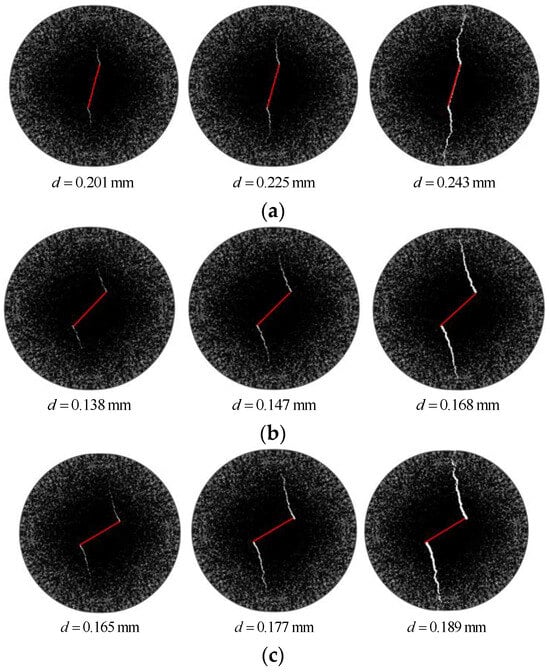 Simulated fracture process for CSCBD with different pre-crack dip angles: (a) ; (b) ; (c) .