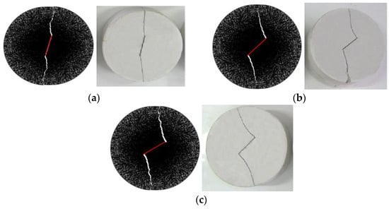 The simulated fracture process is illustrated in Figure 13. The model findings indicate that tensile fracture is the primary failure mechanism for pre-cracked specimens subjected to uniaxial tensile loading. Although the crack-propagation process remained consistent across varying pre-crack dip angles, the resulting propagation trajectories differed. Specifically, at the and angles, the first crack growth exhibited a slight horizontal deviation. By contrast, at , the initial propagation was horizontal. The comparison between the simulated fracture status and the experimental results [66] is shown in Figure 14. It is seen that the simulated fracture status is consistent with experimental observation.