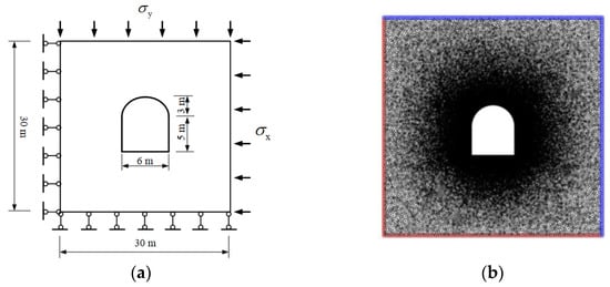 The long-term stability and operational safety of underground tunnels are critical concerns in mining, civil construction, and transportation infrastructure [1,2]. Inadequate assessment of rock mass behavior can lead to deformation and instability, and in severe cases, catastrophic failure can cause financial losses, safety risks, and operational delays. Understanding the deformation characteristics of a surrounding rock mass under diverse geological and loading conditions is essential for the design and maintenance of such structures [3,4,5,6]. As such, the development of accurate and robust numerical models for analyzing deformation and fracture behavior in rock formations, particularly in the context of tunnel engineering, has been a sustained focus of research [7]. Despite advances in numerical modeling techniques [8,9,10], capturing the nonlinear and discontinuous behavior of rock masses under excavation-induced stresses remains challenging [11,12,13].