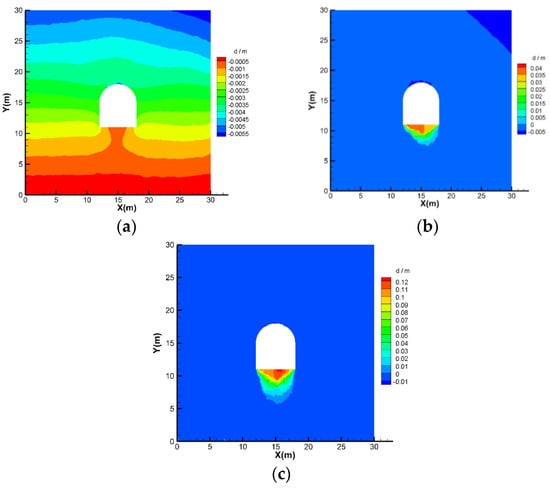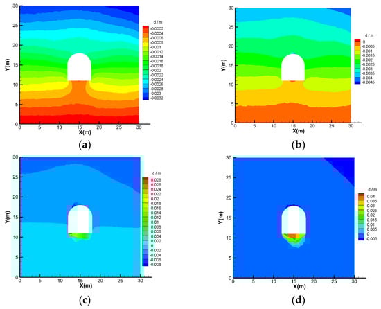Numerical simulations showed that the SW-DVIB model successfully captured plastic deformation, crack initiation and propagation, and stress redistribution under varying in situ stress conditions and Poisson ratios. The radial displacements of the tunnel wall increased with both vertical and lateral stress magnitudes and aligned well with excavation-induced damage patterns. Specifically, displacements increased from at at , confirming the amplifying role of Poisson’s ratio in deformation response. The integration of fracture energy calibration ensured mesh-independent failure behavior, lending physical realism and numerical robustness to the model.