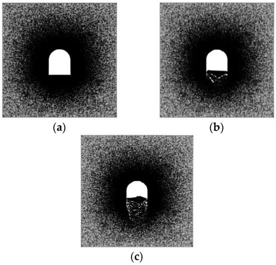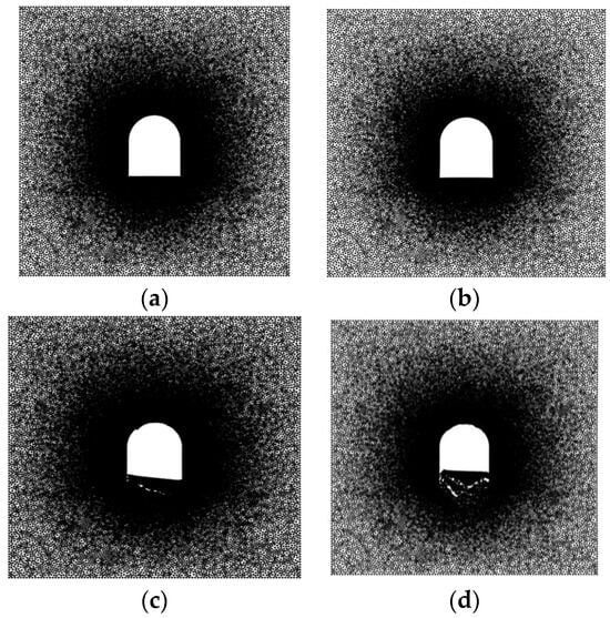 Traditional continuum approaches, such as the Finite Element Method (FEM) and Finite Difference Method (FDM), typically require external remeshing or damage-tracking algorithms to simulate the fracture evolution. Similarly, lattice-based methods often impose fixed Poisson’s ratios and depend on pre-defined failure criteria [37,51,52,53]. The SW-DVIB model mitigates these limitations by enabling both plasticity and fracture to evolve naturally through interparticle interactions. Its fracture energy regularization strategy minimizes mesh sensitivity and produces consistent load–displacement behavior and crack propagation paths, representing an improvement over earlier DVIB implementations [55,63]. These advancements firmly place the model within the domain of mesoscale fracture mechanics and reinforce its applicability to tunnel-stability problems [71].