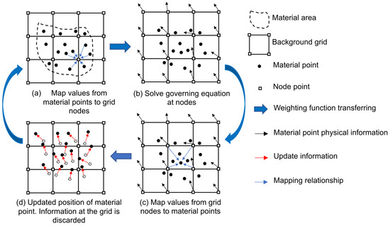 The finite difference method (FDM) primarily employs an Eulerian description, which, while free from grid distortion issues, encounters difficulties with complex geometric shapes, boundary handling, and challenging interface tracking. The finite element method (FEM) and other Lagrangian methods face grid distortion when dealing with large strain problems. Employing erosion algorithms to delete distorted grids can lead to the non-conservation of system mass, while grid re-meshing results in the loss of historical information and increased computational demands. To address the myriad issues associated with grid-based methods, the meshless method emerged. It originated from the smoothed-particle hydrodynamics (SPH) method proposed by Gingold [10], which, although unaffected by grid characteristics and suitable for handling large deformations, still faces issues such as low computational efficiency, complex contact algorithms, and difficult boundary condition handling. In this context, the material point method (MPM) has garnered significant attention due to its advantages in easily handling large deformations, no particle interface crossing, and high computational efficiency.
