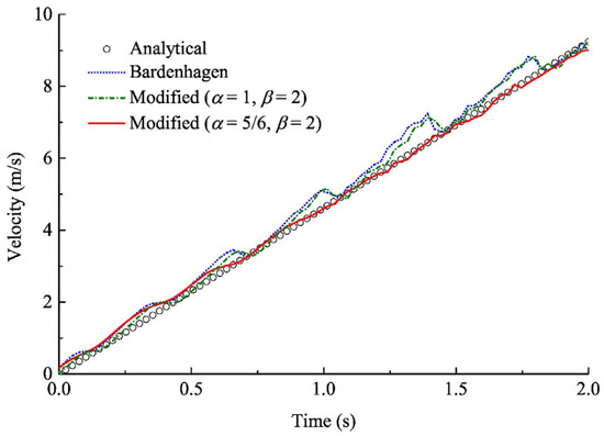 To prevent numerical oscillations caused by material points passing through grid boundaries, Bardenhagen et al. [30] proposed the generalized interpolation MPM (GIMP) based on the Petrov–Galerkin method and successfully studied the dynamic response of a rod given an initial velocity impacting a rigid wall. Compared to the MPM simulation results, the solutions obtained by the GIMP are smoother and more continuous. Hu et al. [31] introduced the convected particle domain interpolation technique into the MPM, employing a particle–particle contact algorithm to handle more complex high-speed impact and multi-body contact elastoplastic fracture problems.