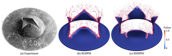 During explosions, interactions between fluids and solids are typically involved. To address this, Wang et al. [48] developed an MPM for simulating the detonation of explosives involving fluid–structure interaction (FSI). Chen et al. [49] applied the MPM to underwater explosion simulations, calculating the shock waves generated during the explosion and observing the diffusion process of the explosion. Li et al. [50] successfully modeled the fragmentation of plates and structural damage to ship hulls subjected to underwater contact explosions by implementing a staggered grid scheme to mitigate cell intersection noise and improve the precision of fluid simulations. The experimental findings were in concordance with the simulation results (see Figure 7).