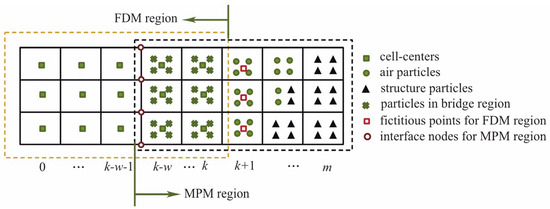 In explosion simulations, the boundary conditions at the interfaces between solid and fluid regions are often very complex. To effectively handle the issues at the multi-material interfaces, Cui et al. [51] combined the advantages of the FDM and MPM to propose a coupled finite difference MPM (CFDMP). In the contact area, the MPM maps variables from the MPM background grid nodes to the FDM virtual points to provide boundary conditions for the FDM region; simultaneously, the FDM maps variables from the FDM cell center points to the MPM interface grid nodes to provide boundary conditions for the MPM region (see Figure 8). Li et al. [52] simulated the physical process of gas–solid flow in thermite explosions.