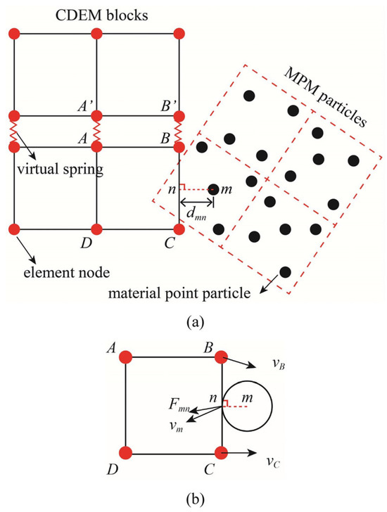 Schematics of MPM–CDEM coupled analysis: (a) contact detection; (b) contact force calculation [53].