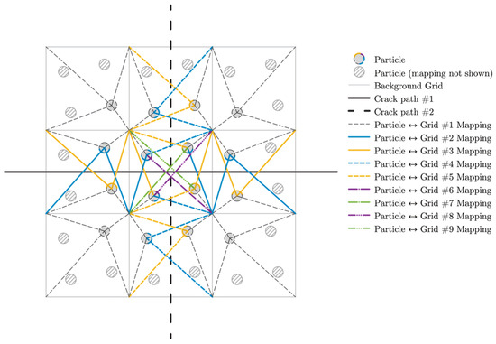 Nairn [60] developed an improved MPM scheme (CRAMP) for simulating cracks with discontinuities in displacement and velocity. In this method, background grid nodes can have multiple velocity fields, allowing adjacent particles to move and deform independently to simulate discontinuities. However, this CRAMP scheme does not have the capability to simulate concurrent crack initiation and propagation nor the ability to propagate cracks to the material’s edge. To address this, Adibaskoro et al. [61] made improvements by introducing additional grids to simulate any number of crack paths (see Figure 10). They defined a ghost tip point for each active crack tip, located on the trajectory of the crack tip and at a distance equal to twice the defined propagation length, thus enabling the simulation of multiple crack initiations, extensions, and coalescences.